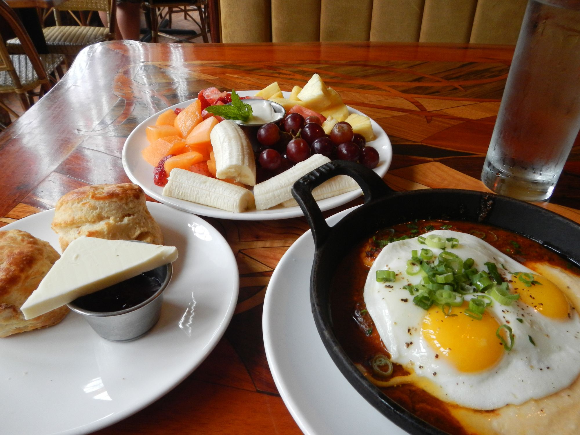 It all needed to start out with a proper American breakfast; Shrimp and Grits with a sunny-side up egg over ’em, side of biscuits, and a proper sized fruit salad (I didn’t eat the bananas).